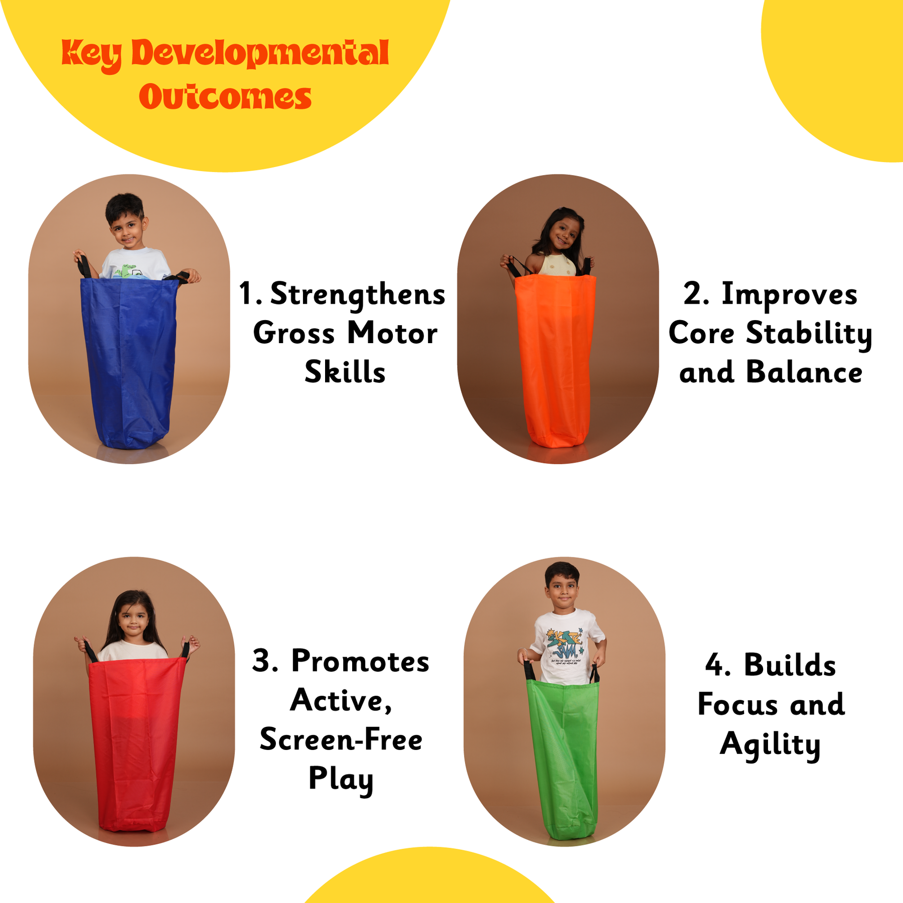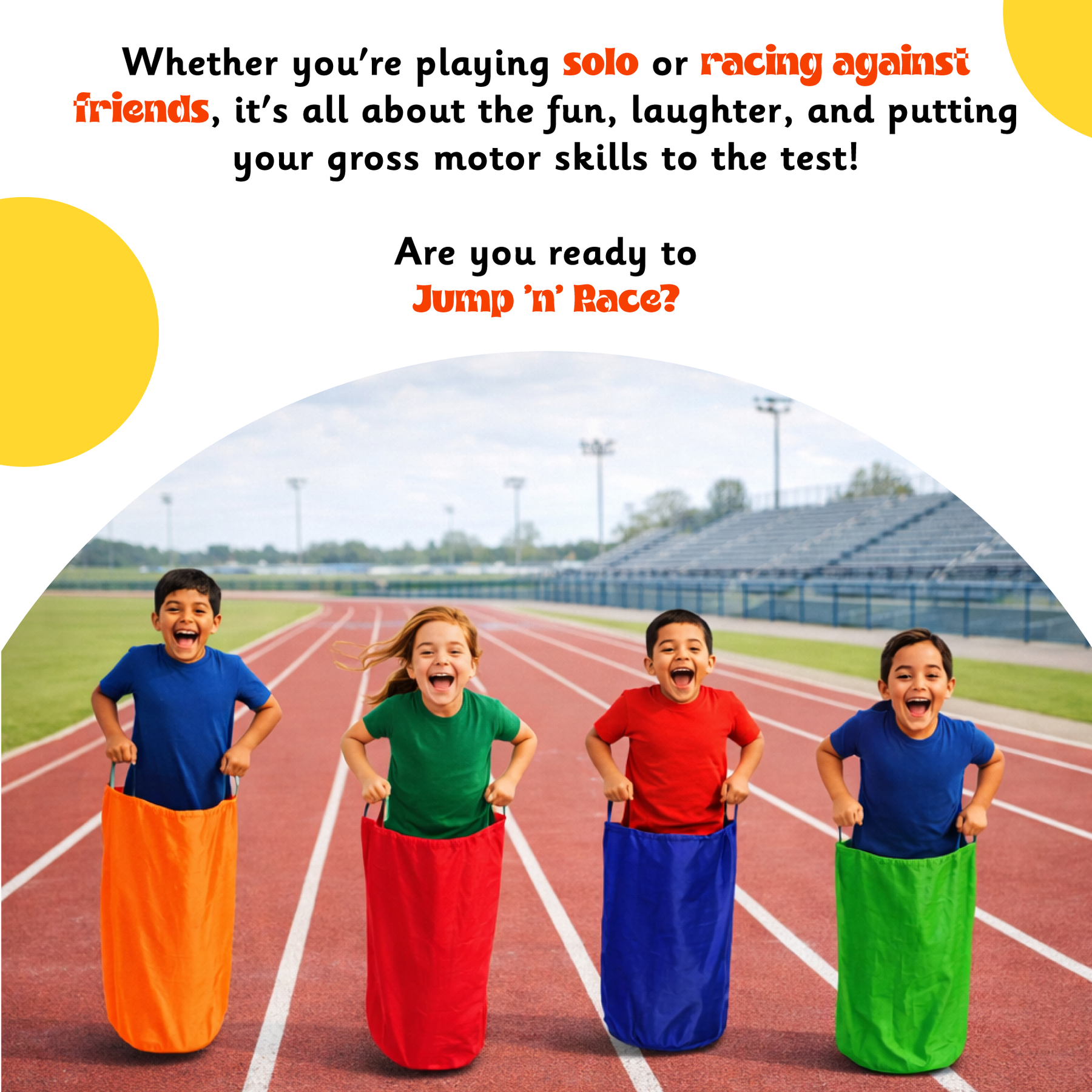 Step into your sack, hold tight, and hop your way to the finish line in this classic potato sack race! Whether you're playing solo or racing against friends, it's all about the fun, laughter, and putting your gross motor skills to the test! Are you ready to Jump 'n' Race?