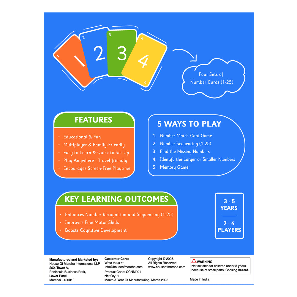 Numero Match is a fun and educational, screen-free card game for kids aged 3-5 years, designed to boost number recognition and sequencing skills (1-25). With five exciting ways to play, it's perfect for families, travel or group play. Easy to learn and quick to set up, this versatile game encourages cognitive development while keeping little learners entertained.